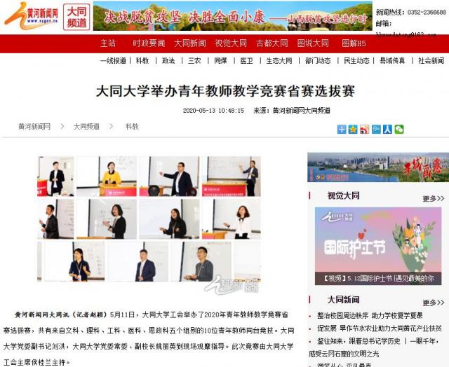 黃河新聞網大同訊(記者趙穎)5月11日,大同大學工會舉辦了2020年青年教師教學競賽省賽選拔賽,共有來自文科、理科、工科、醫科、思政科五個組別的10位青年教師同臺競技。大同大學黨委副書記劉洪,大同大學黨委常委、副校長姚麗英到現場觀摩指導。此次競賽由大同大學工會主席侯桂蘭主持。
