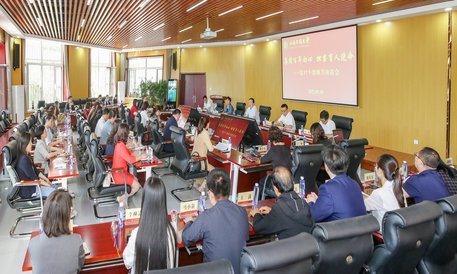 9月10日,金秋送爽,風清氣朗,全國第37個教師節如約而至。上午9時,在文德樓多功能會議室,我校慶祝第37個教師節“賡續百年初心,擔當育人使命”教師代表座談會在熱烈溫馨的氣氛下拉開帷幕。校黨委書記弓永華,校黨委常委、副校長姚麗英,校黨委常委、組織部部長白昕,校黨委常委、宣傳部部長楊容出席。42名教師代表及相關職能部門負責人參加座談。校黨委副書記劉洪主持。