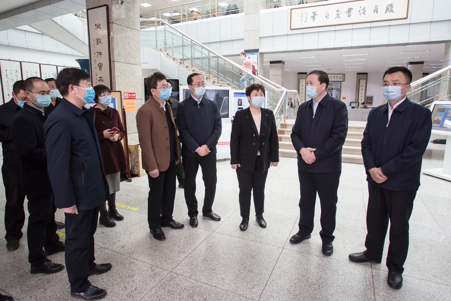 圖書館內,同學們分散就坐,有的在奮筆疾書,有的在專心閱讀,到處是一派寧靜祥和的溫馨氛圍。弓永華、姚麗英來到圖書館,查看館內疫情防控工作落實情況,了解部門2022年重點工作部署,重點就用好館藏圖書資源、用活空間資源,為廣大師生員工打造高水平知識殿堂和學習空間開展調研。