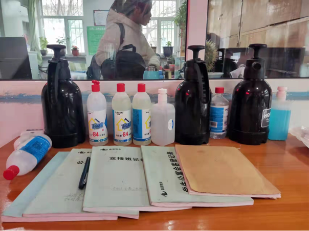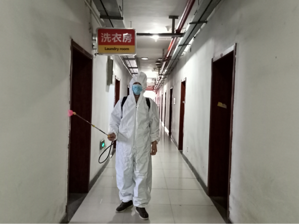 早上六點,天剛蒙蒙亮,宿管阿姨和大爺們按照1瓶消毒液 1壺水的比例進行配比,開始了一天的第一次消殺工作。一桶配好的消毒水大概有40斤,從一樓到六樓,全部消毒完成,需要半個小時,這樣的工作一天兩次,一周七天,從不間斷。如月苑四號樓的大爺說,背著40多斤的消毒設備上下樓梯,對他的體力也是一種考驗,但這是他的工作,是疫情防控的需要,絕對不能含糊。宿管阿姨們負責用酒精擦拭門把手、樓梯欄桿等所有同學們容易觸碰到的部位,一寸一寸、一處一處,耐心細致不落下任何一個角落。如果說大爺做的是體力活,那阿姨就做的是精細活,他們都在用自己力所能及的方式共同守衛著公寓的安全。