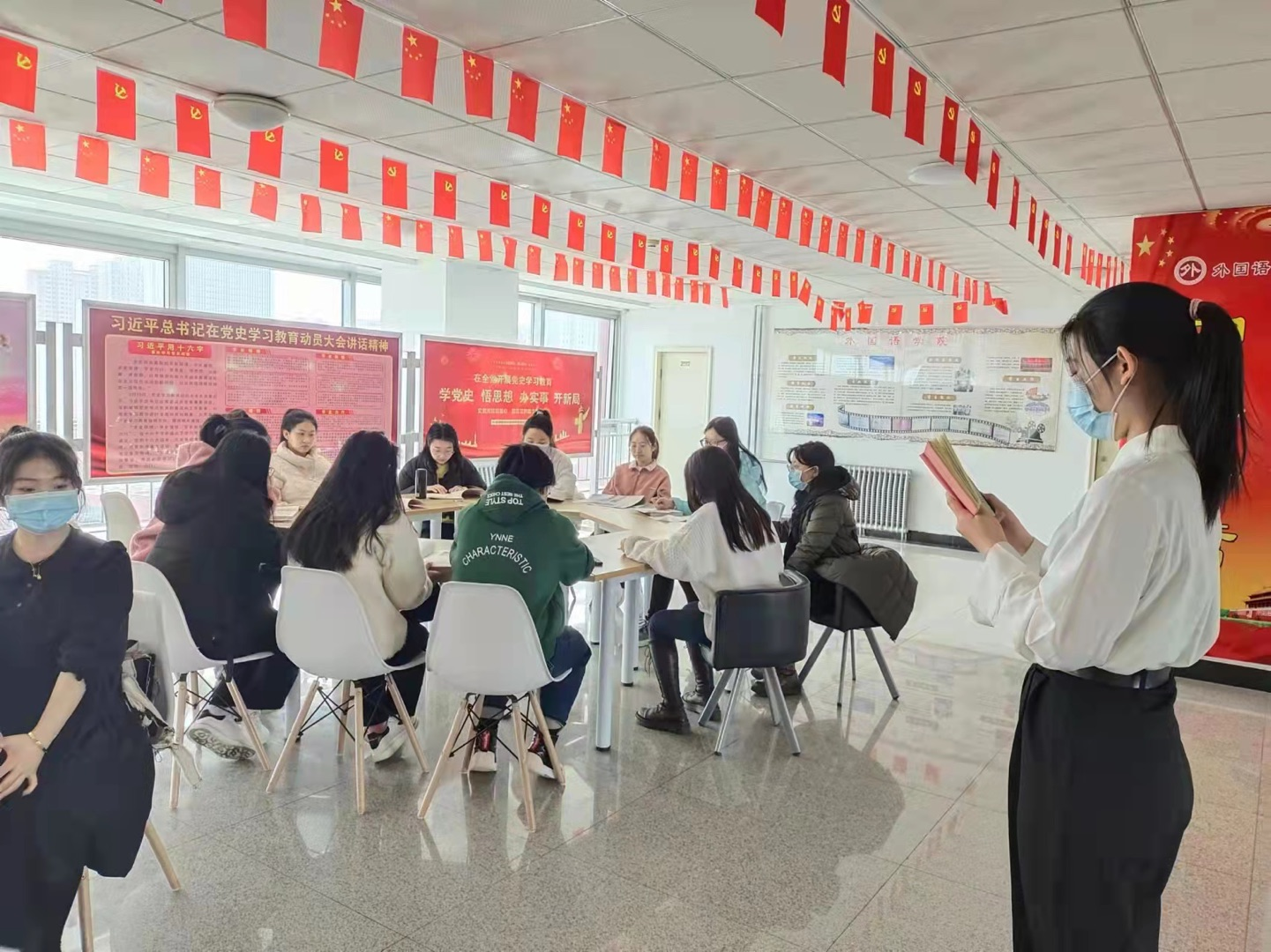 為引導廣大學生黨員知黨愛黨,在紅色書籍中厚植家國情懷、傳承紅色基因、汲取精神動力,外國語學院學生黨支部于行知樓九層大廳開展了“紅色經典潤初心”主題黨日活動。學生黨員、入黨積極分子閱讀黨史、《求是》雜志以及近期的報刊雜志,在學習中感悟黨的思想偉力,在書籍中探索黨的光輝歷程。在讀書分享環節,結合當前疫情防控形勢,同學們紛紛表示,“物有甘苦,嘗之者識;道有夷險,履之者知。”在這場波瀾壯闊的抗疫斗爭中,我們積累了重要經驗,收獲了深刻啟示。抗疫斗爭的偉大實踐再次證明,中國共產黨具有無比堅強的領導力,是風雨來襲時中國人民最可靠的主心骨。