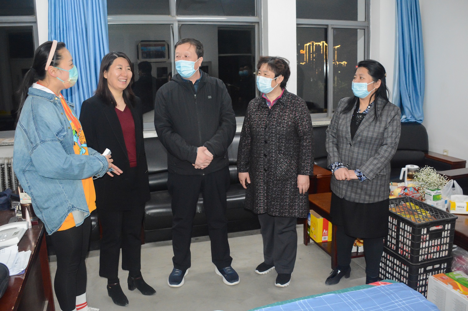 披星戴月送溫暖,入微服務暖人心。4月12日晚,夜風寒涼,暮色深沉,校園里卻依然燈火通明。在結束了一天繁忙工作后,弓永華、姚麗英帶領全體校領導深入農學與生命科學學院、音樂學院、校醫院、食堂等地,看望慰問駐校教職工、醫護人員和餐飲服務人員,實地查看大家的辦公、住宿環境,了解生活需求,聆聽工作感悟,感謝大家的辛苦付出,表示會以大家的需求為導向,隨時解決困難。
