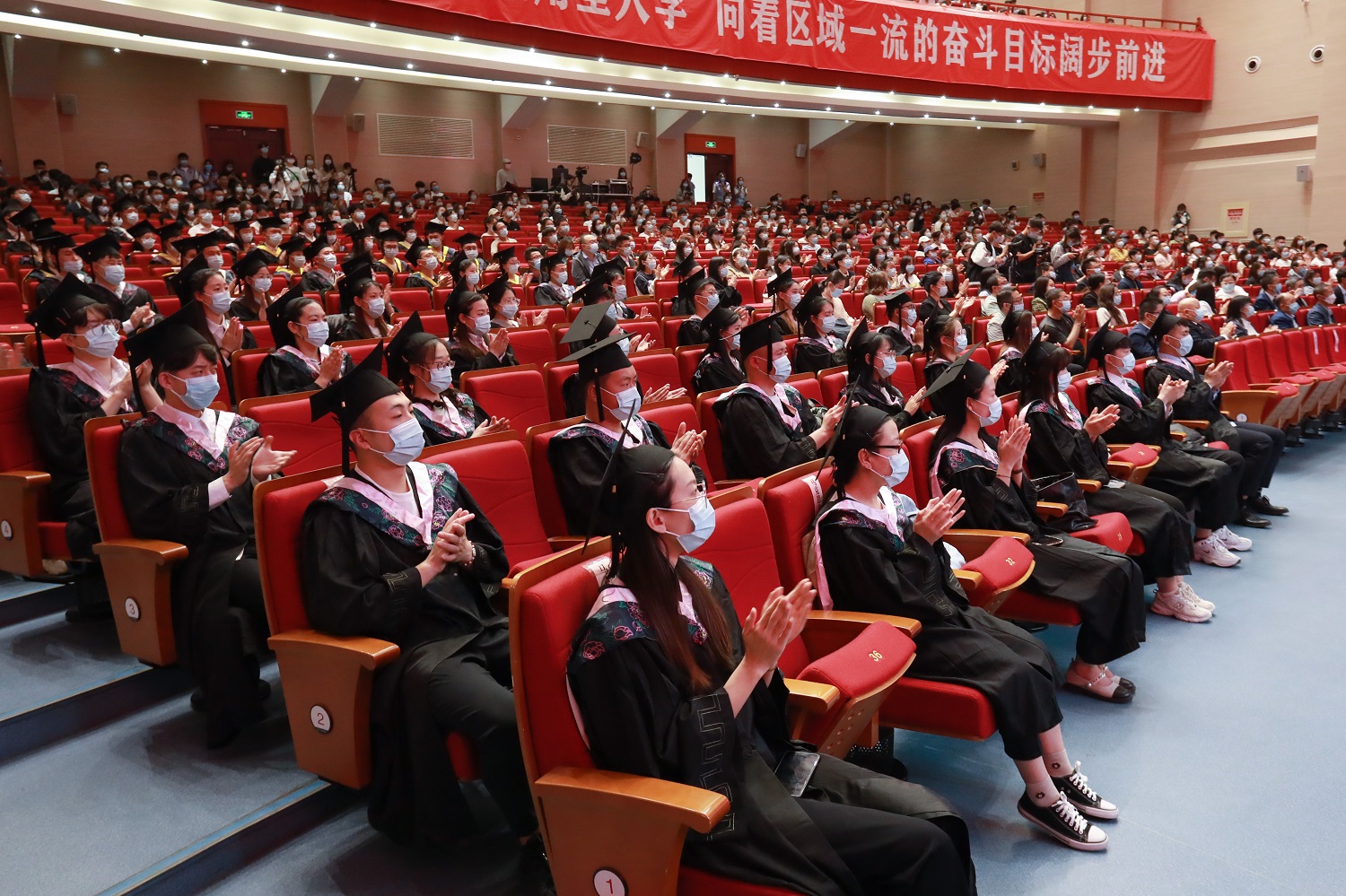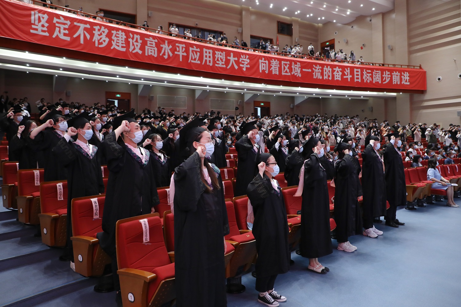 全體畢業生神情肅穆、莊嚴宣誓:厚德載物,博學自省,慎思明志,篤行以敬……心懷偉大中國夢,共筑時代民族魂。誓言鏗鏘,征程啟航。