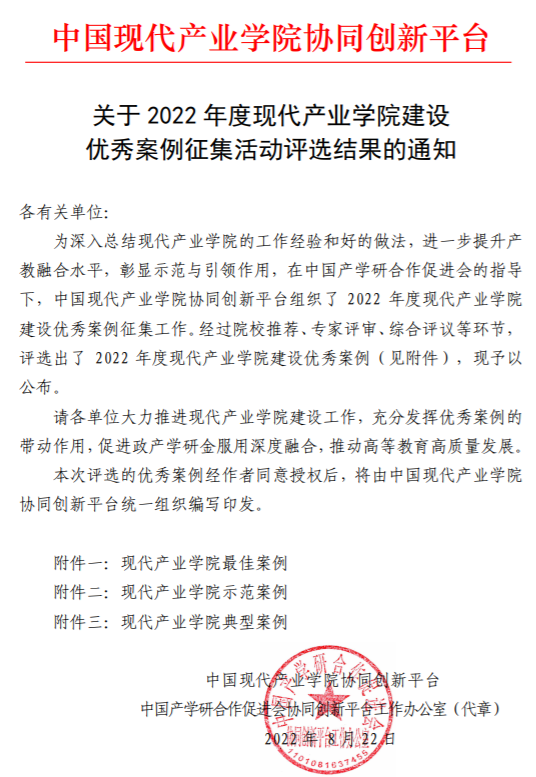 8月22日,中國現代產業學院協同創新平臺、中國產學研合作促進會對2022年度現代產業學院建設優秀案例評選結果進行了公示。此次評選歷時6個月,經過院校推薦、專家評審、綜合評議等環節,評選出了2022年度現代產業學院最佳案例、現代產業學院示范案例和現代產業學院典型案例共67家現代產業學院建設優秀案例。