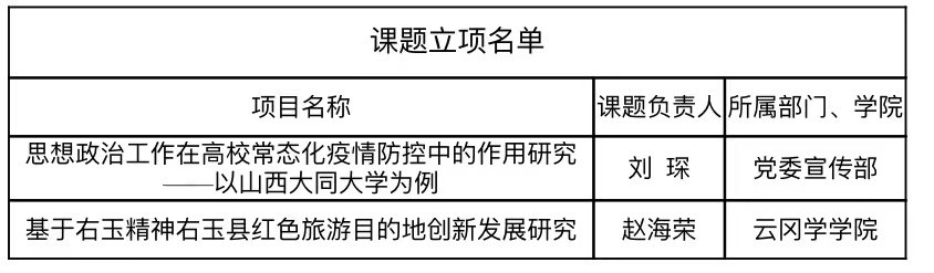 ? 近日,根據中共山西省委宣傳部下發的立項通知書,我校共2項課題被確定為山西省思想政治工作研究會2022年度課題。