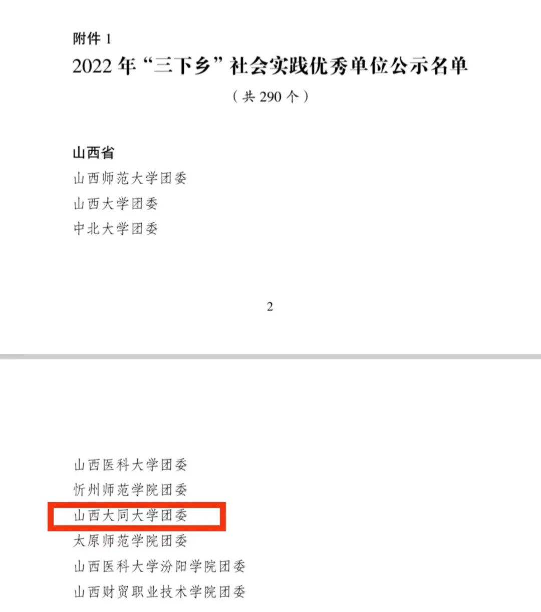 經基層申報、團省委審核推薦、團中央組織評議等環節,10月21日,團中央相關部門對“三下鄉”社會實踐優秀集體、個人和項目進行通報表揚。我省16個單位、30支團隊、36名個人進入通報表揚名單,我校名列其中,榮獲2022年全國“三下鄉”社會實踐優秀單位和山西省“三下鄉”社會實踐優秀單位。