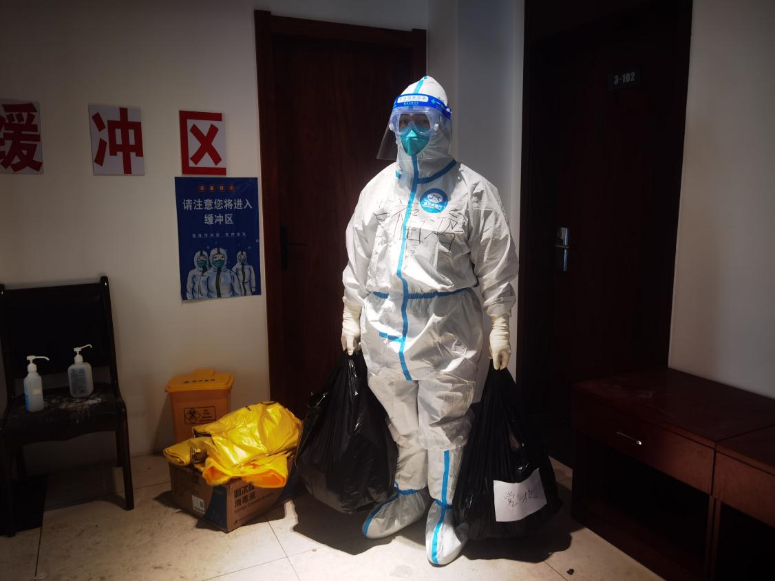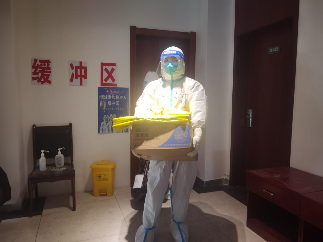 在進駐封閉區的這段日子里他服務的是一個“特殊”的群體——進行健康監測的出艙學生從這一刻起,他化身“家政服務生”為同學們提供送餐、垃圾清運、生活必需品傳遞等工作,每天穿脫防護服多次、徒步上下5層樓多次。從早上5點核酸檢測開始直至深夜,為同學們提供熱菜熱飯、急需的生活用品等,他在厚厚的防護服包裹下疾步行走每每都是汗水打濕了全身、大口大口吸著空氣每當結束一次次的工作,脫下防護服的那一刻,盡管筋疲力竭、衣裳盡濕但收獲的是滿滿的自豪和滿足,覺得所有的辛苦都是值得的。在這次戰“疫”中,他沒有旁觀,勇于擔當,用付出和真心譜寫著抗疫的華章。