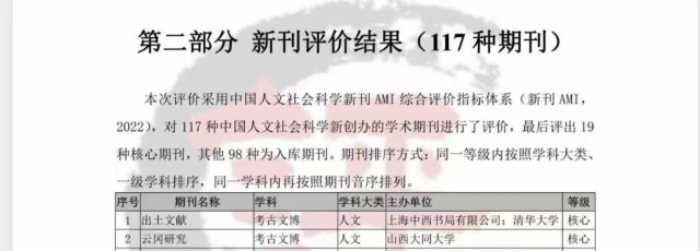 1月12日,中國社會科學評價研究院公示《中國人文社會科學期刊 AMI綜合評價報告(2022年)》。報告對中國人文社會科學33個學科類的2189種期刊進行了評價,其中有1924種老牌刊、117種新創刊和148種外文刊。評價分為頂級、權威、核心、擴展、入庫五個等級。在117種2017年以后新創的期刊中共有19種評為核心期刊,我校創辦的《云岡研究》即為其中之一。這一成績是舉全校之力共同打造的結果,也是《云岡研究》全體編輯辛勤付出的回報。