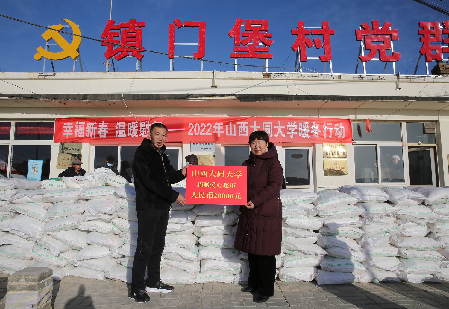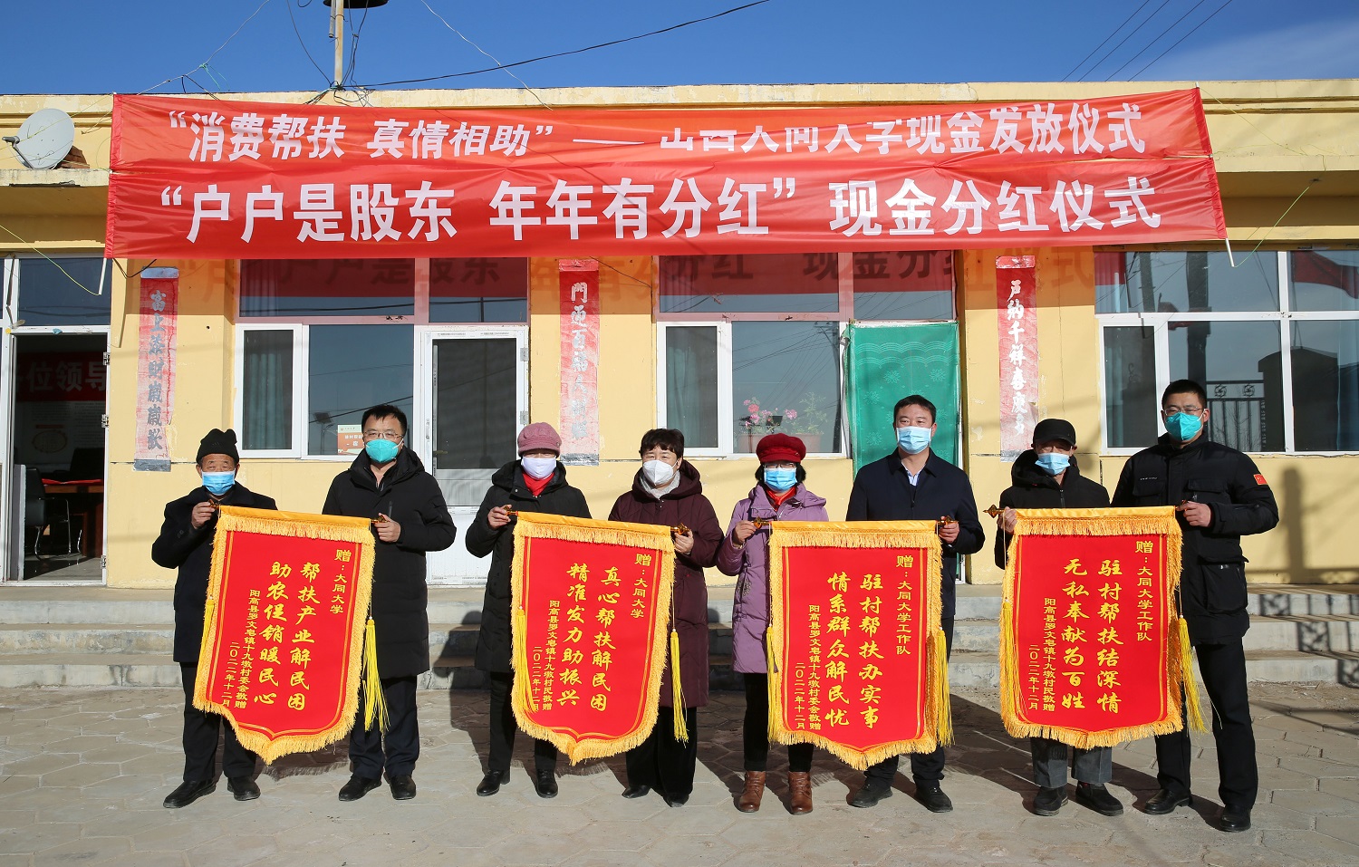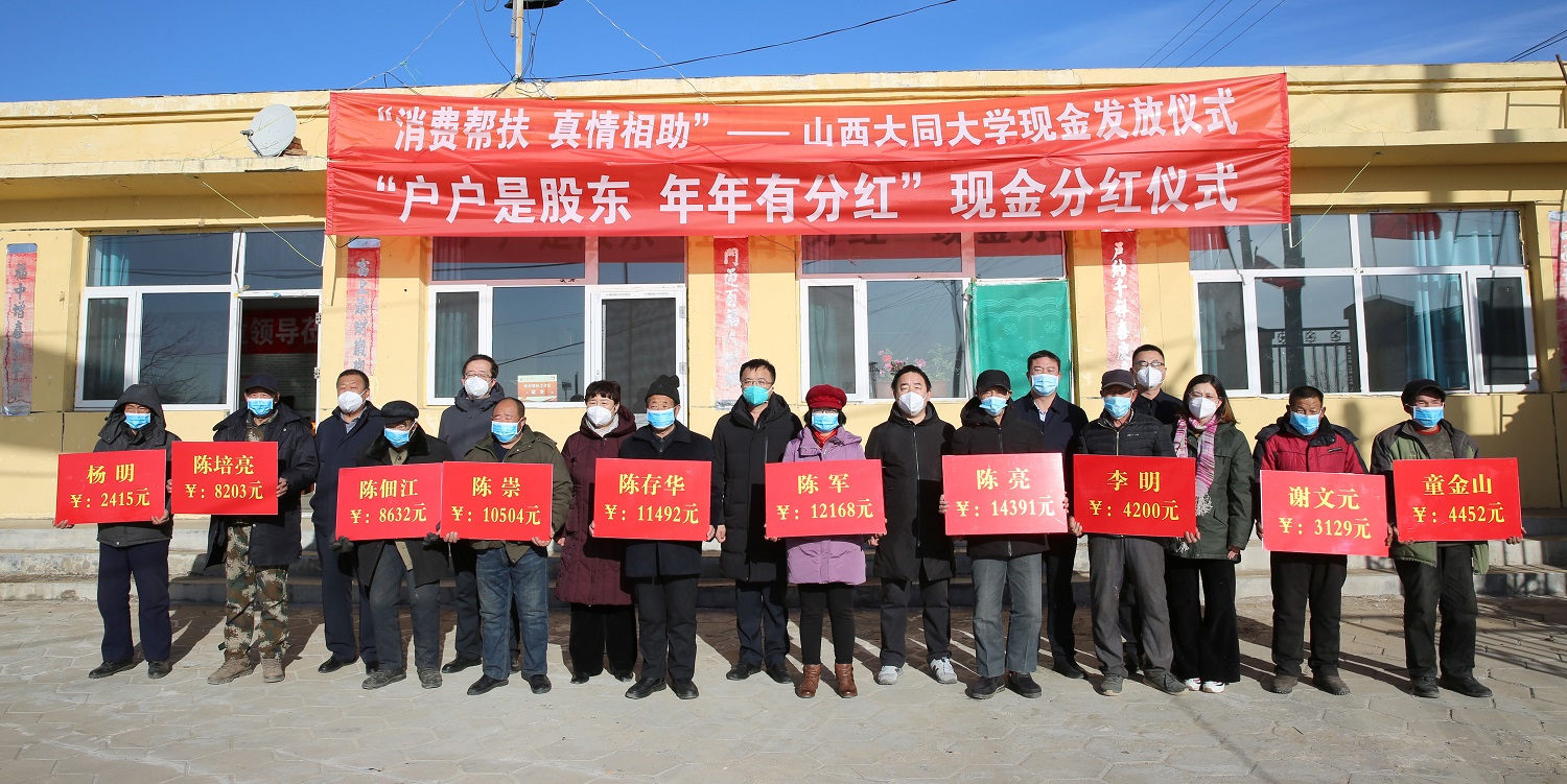 春節將至,幫扶村處處充滿了節日的喜慶氣氛。在分紅儀式上,姚麗英、寇福明、王崇虎為謝莊村、十九墩村的村民代表們一一發放“寒富蘋果、大蔥消費扶貧項目”和羊場的現金分紅,并祝愿鄉親們收入一年比一年高、日子一年比一年好!村民們的喜悅和感恩之情溢于言表:“感謝黨和國家的好政策,感謝總書記的深切關懷,感謝大同大學的真情幫扶!年年都能領到分紅,相信我們的日子會越過越好!”十九墩村村委會和村民為大同大學和大同大學工作隊贈送錦旗,以此感謝學校和駐村工作隊長期以來的傾情幫扶。