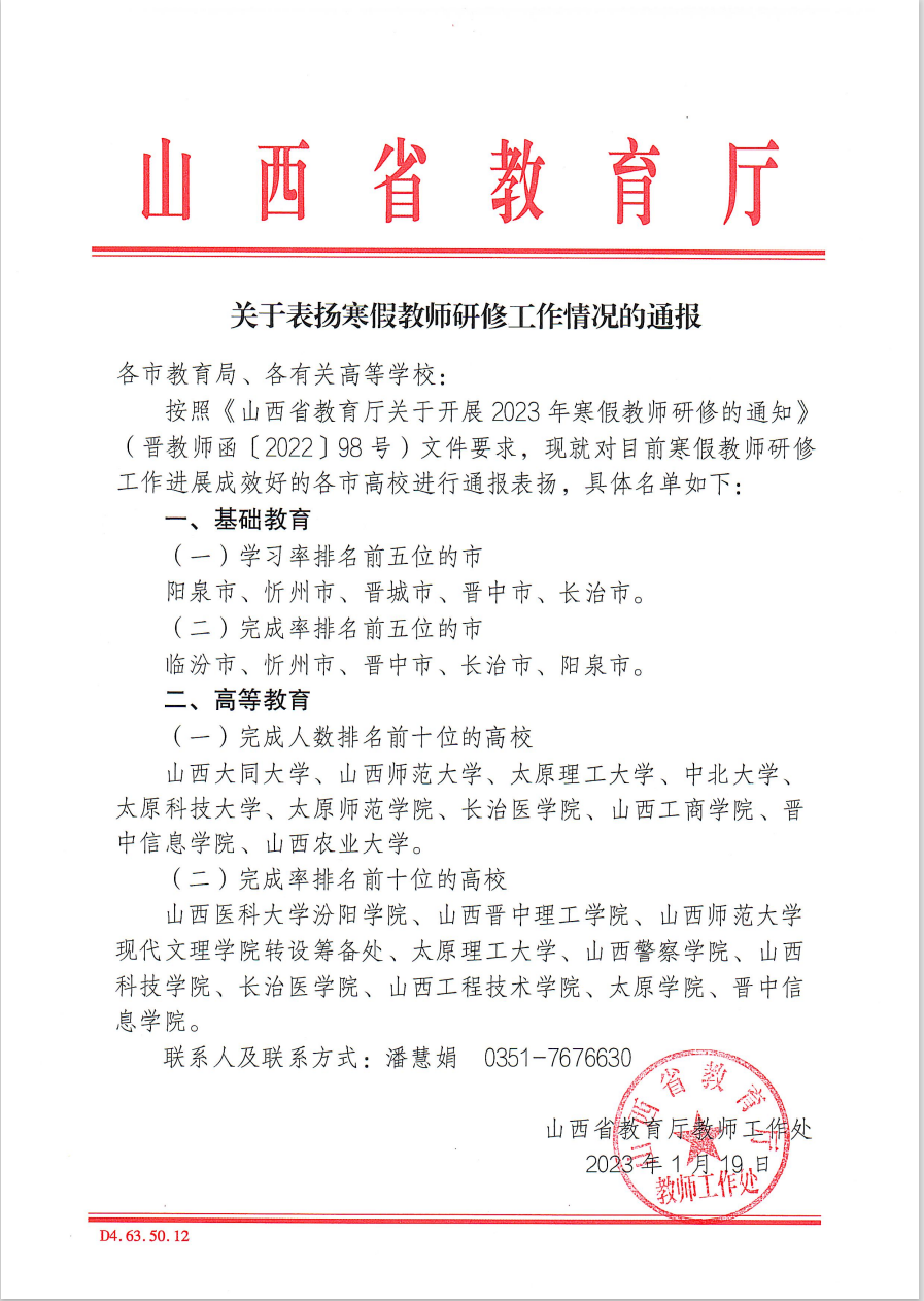 為落實教育部辦公廳和山西省教育廳《關于開展2023年寒假教師研修的通知》精神,深入學習貫徹黨的二十大精神,貫徹落實習近平總書記關于教育的重要論述,推進實施教育數字化戰略行動,服務教師教書育人工作和教育教學能力提升,我校組織全校教師開展了寒假教師研修活動。近日,山西省教育廳下達了《關于表揚寒假教師研修工作情況的通報》,對全省寒假教師研修工作進展成效好的高校進行通報,我校完成人數在全省高校中排名第一,繼暑期教師研修之后,再次受到省教育廳的肯定和表揚。
