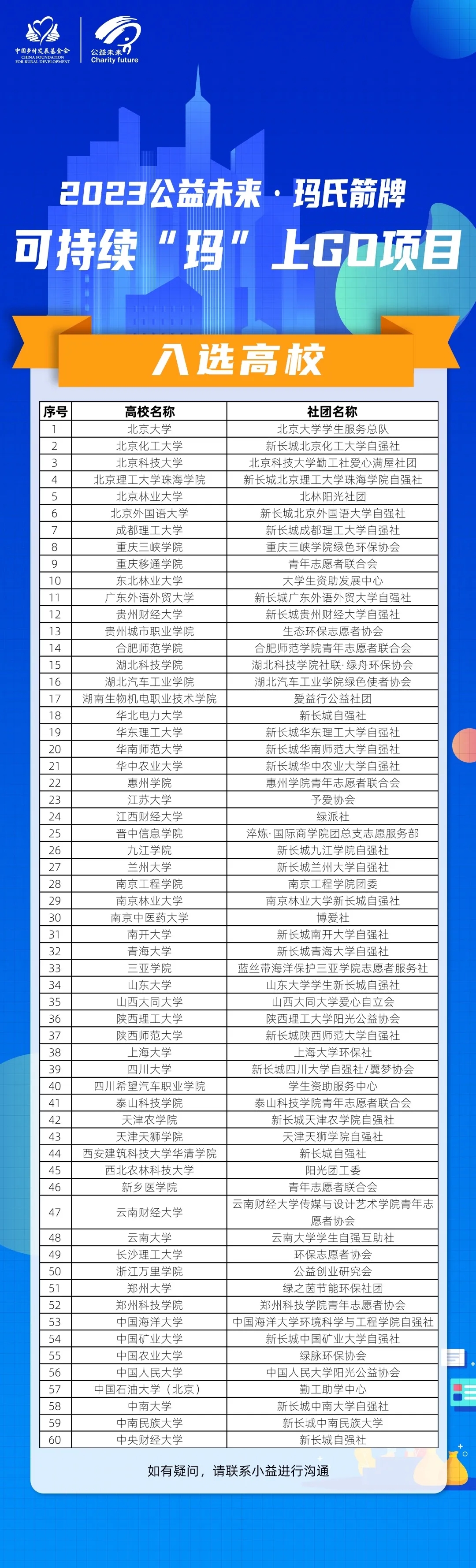 該項目是由中國鄉村發展基金會、瑪氏箭牌糖果(中國)有限公司聯合主辦,在高校開展的全國青年公益實踐大賽與社區嘉年華活動,旨在鼓勵青年人圍繞生活中垃圾產生、丟棄及再利用等環保問題,提出創新解決方案。今年全國共有372所高校參與評選,最終60所高校成功入選。
