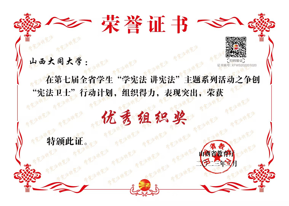 ? 近日,第七屆全省學生“學憲法 講憲法”主題系列活動落下帷幕,我校師生斬獲多項榮譽:學校獲得“憲法衛士”行動計劃“優秀組織獎”,辦公室司海軍老師榮獲“優秀管理員獎”;法學院郭佳琦同學榮獲第七屆全國學生“學憲法 講憲法”山西賽區總決賽高校組二等獎;法學院黃紫焰等4名同學榮獲“征集憲法主題演講稿”高校組一等獎1項、二等獎1項、三等獎2項,李婷老師獲“優秀指導教師獎”。