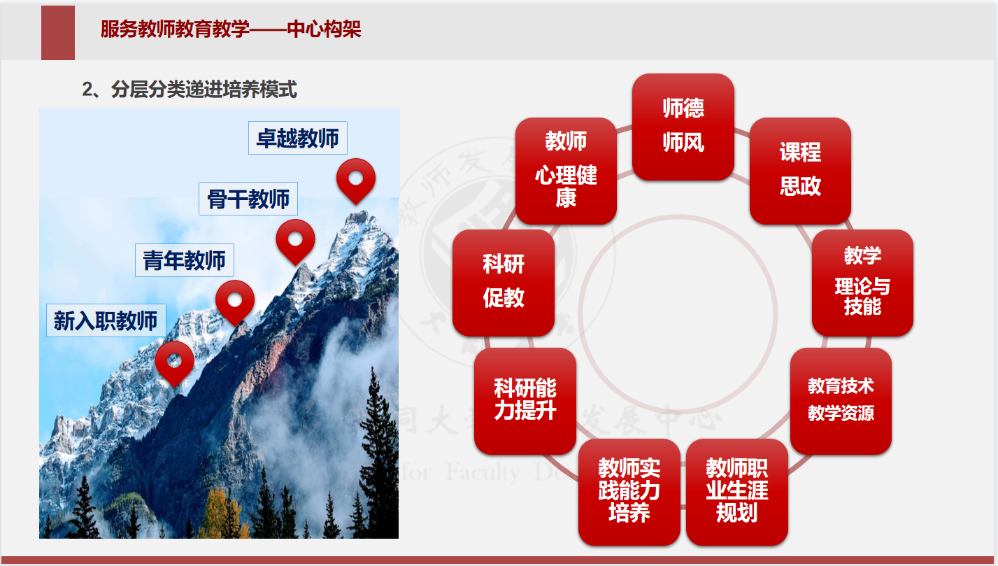 為打造高素質(zhì)專業(yè)化創(chuàng)新型教師隊(duì)伍,教師發(fā)展中心構(gòu)建了“三級(jí)四類五法”培訓(xùn)模式,由學(xué)校、學(xué)院、系(教研室)三級(jí)對(duì)新入職、青年、骨干、卓越四類教師,采用線上+線下、校內(nèi)+校外、集體+自主、研訓(xùn)+指導(dǎo)、理論+實(shí)踐五種方法相結(jié)合進(jìn)行分層分類遞進(jìn)系統(tǒng)化培養(yǎng)。