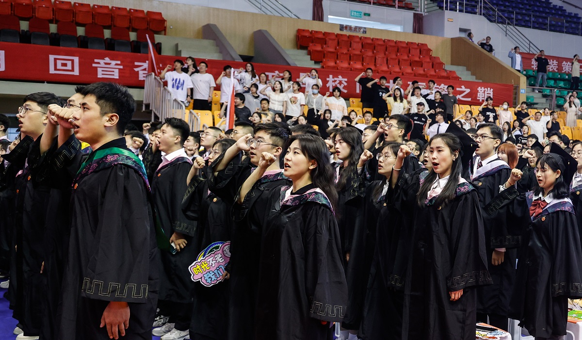 全體畢業(yè)生神情肅穆、莊嚴宣誓:厚德載物,博學自省,慎思明志,篤行以敬……心懷偉大中國夢,共筑時代民族魂。誓言鏗鏘,征程啟航。