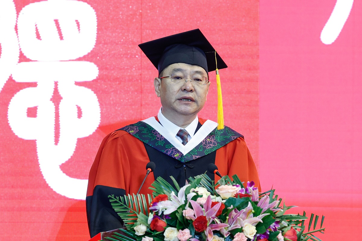 “你們用最好的四年收獲知識、增長才干、錘煉品格,在抗擊疫情中默默堅守,在比賽競賽中展現(xiàn)風采,在志愿服務中無私付出,在創(chuàng)新創(chuàng)業(yè)中爭當表率,以過硬的能力素質(zhì)和精湛的專業(yè)本領,交出了光彩奪目的優(yōu)異答卷。”姚麗英校長深情講述著碩士研究生馮海弟、本科生武書婷等本屆優(yōu)秀畢業(yè)生們的勵志故事,講述著劉穎斌、韓生等歷屆優(yōu)秀校友的卓越成就與數(shù)年如一日的堅持堅守,語重心長激勵全體2023屆畢業(yè)生們秉承同大精神,堅守初心,摒棄浮躁,腳踏實地做一個有用的人:一是始終涵養(yǎng)理想之心,在真學真信、常學常新中筑牢信仰之基。向陽而生、逐光而行,心存希冀、目有繁星,腳踏實地、行穩(wěn)致遠,在實現(xiàn)中華民族偉大復興中國夢的新征程上奮勇搏擊。二是始終涵養(yǎng)奮斗之心,在守正創(chuàng)新、謀事干事中力行利民之事。要在奮斗之路上披荊斬棘、乘風破浪,永遠不與躺平、困難和解,懷揣鴻鵠之志,堅持不懈用勞動創(chuàng)造幸福、創(chuàng)造未來、創(chuàng)造歷史。三是始終涵養(yǎng)擔當之心,在兢兢業(yè)業(yè)、恪盡職守中擔起民族復興之責。要有擔當?shù)闹練狻數(shù)墓菤馀c擔當?shù)牡讱猓愿覟槿讼鹊暮狼椤⒃鶎拥奶嵑陀y而上的脊梁,勇立中國式現(xiàn)代化的潮頭,堅守厚德之大道,努力培養(yǎng)美美與共、天下大同的精神氣質(zhì),賡續(xù)同大精神,建設美好中國。