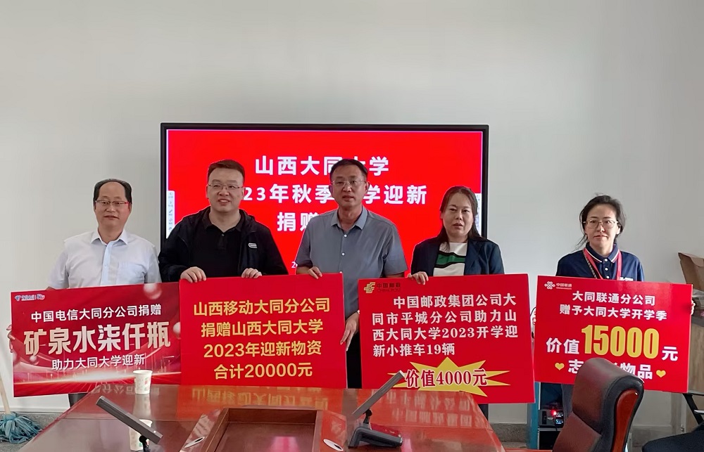 ? 為更好地助力我校2023年秋季開學迎新工作,山西移動大同分公司等多家企業向我校捐贈迎新物資。9月11日上午,捐贈儀式在敬德樓四層會議室進行。學生工作部部長楊容,山西移動大同分公司、大同聯通分公司、中國電信大同分公司、中國郵政集團大同市平城區分公司相關負責人參加了本次捐贈儀式。