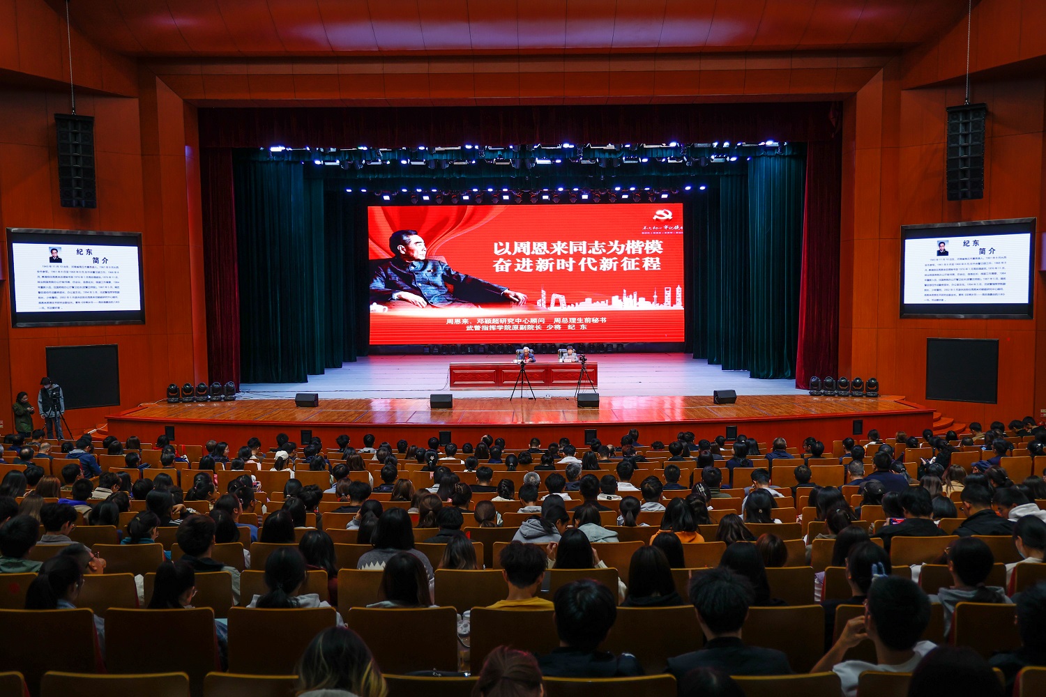 從1968年8月15日踏入中南海西花廳,到1976年1月8日周恩來(lái)總理逝世,紀(jì)東老師一直擔(dān)任周總理秘書(shū)。這8年間,他見(jiàn)證了周恩來(lái)總理為國(guó)為民、殫精竭慮的晚年歲月。講座中,他從“不忘初心,堅(jiān)定不移的信念”“心系人民,甘當(dāng)公仆的精神”“持之以恒,嚴(yán)于律己的修養(yǎng)”“鞠躬盡瘁,敢于擔(dān)當(dāng)?shù)钠犯瘛彼膫€(gè)方面入手,通過(guò)展示大量珍貴的史料圖片、講述一個(gè)個(gè)生動(dòng)的感人故事,深切緬懷了周恩來(lái)同志鞠躬盡瘁、死而后已的一生,深刻詮釋了其全心全意為人民服務(wù)的精神風(fēng)范。紀(jì)東老師如數(shù)家珍般娓娓道來(lái),講述中幾度哽咽,在場(chǎng)師生深受感染感動(dòng),掌聲經(jīng)久不息。