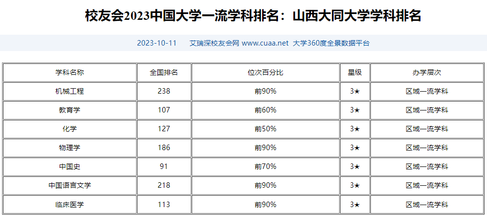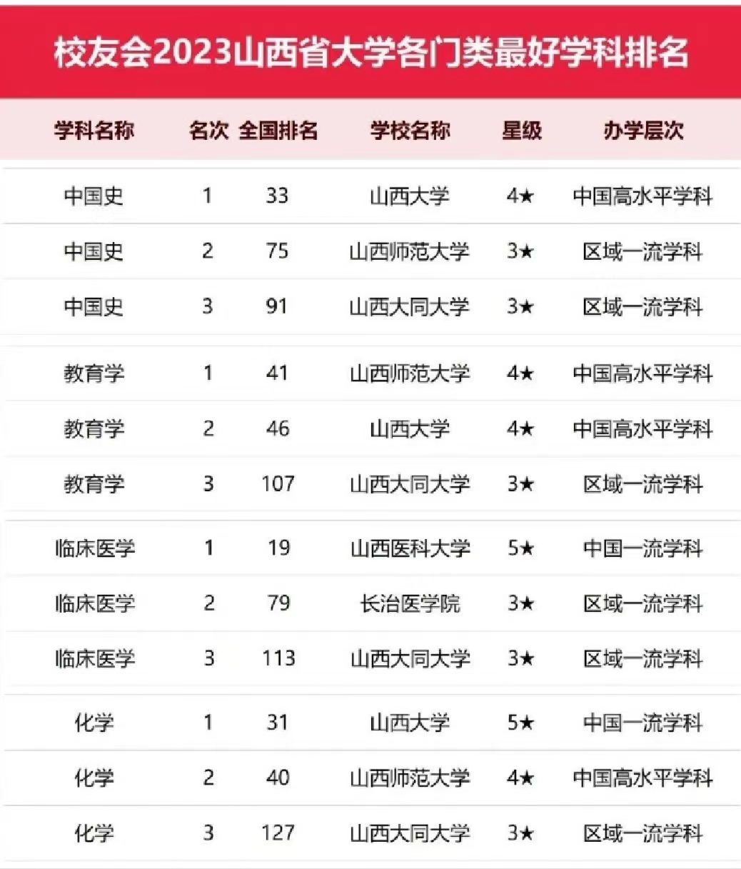 據悉,艾瑞深中國雙一流建設評價課題組依據校友會2023中國大學一流學科排名上榜學科的星級排名、位次百分比和位次區間等3大標準提出校友會2023中國最好學科和中國各地區最好學科遴選標準。校友會中國各地區最好學科遴選標準為:1.中國最好學科入選學科;2.全國各地區排名前3名學科;3.中國五星級學科和中國四星級學科。依據此遴選標準,我校中國史、教育學、臨床醫學、化學4個學科榮登校友會2023山西省大學最好學科排名榜單。