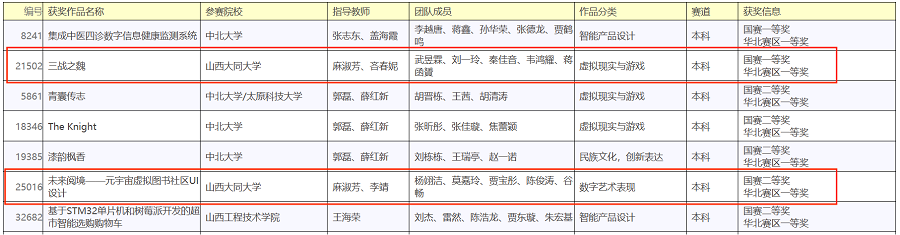 第十一屆全國大學生數字媒體科技作品及創意競賽自3月份啟動以來,在全國31個省/直轄市/自治區設立賽區,有近1700多所高校的7萬多個參賽團隊報名參賽,近20萬名指導教師和學生參與,根據全國總決賽獲獎比例一等獎5%、二等獎10%的賽程設置,選拔入圍總決賽作品1578件。本屆競賽從參賽團隊數量、參賽學校層次、參賽作品質量及大賽認可度都達到了歷屆之高。山西賽區作品在總決賽中共獲得國賽一等獎2項、國賽二等獎5項,具體獲獎信息如下。