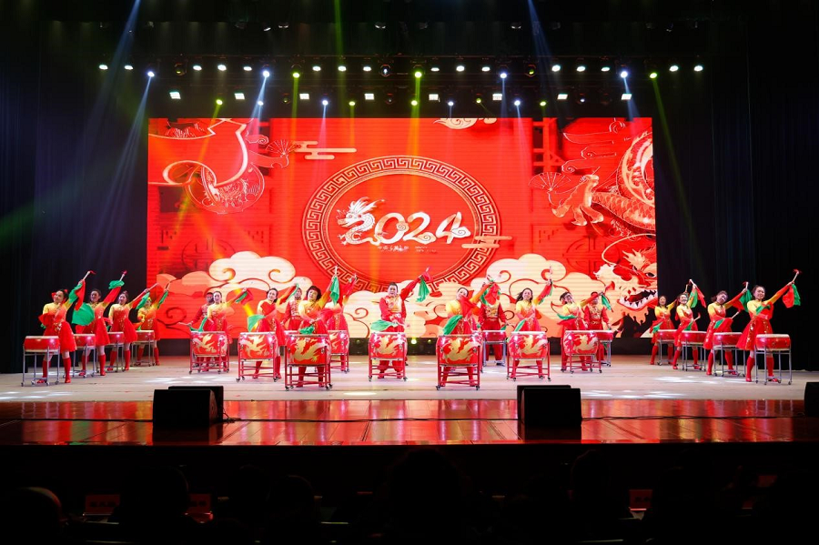 元旦文藝晚會在新平旺綜合分工會和建筑與測繪工程學院分工會聯合表演的開場音樂鼓《盛世歡歌》中拉開帷幕。
