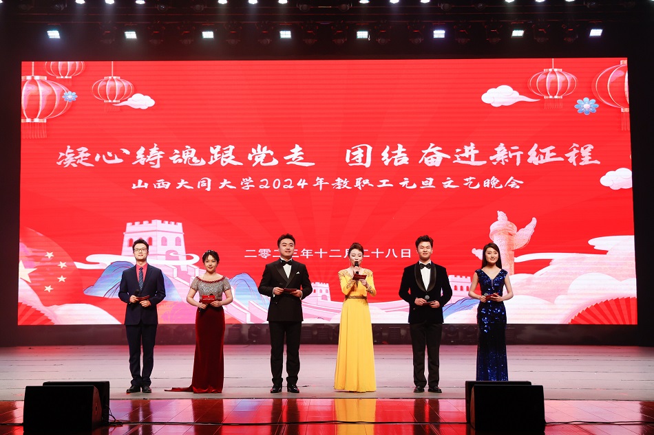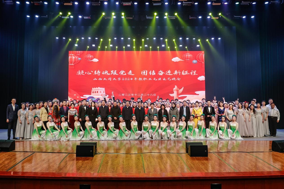 ?? 璀璨華章,喜迎元旦。12月28日,由校工會主辦的“凝心鑄魂跟黨走 團結奮進新征程”山西大同大學2024年教職工元旦文藝晚會在本真樓演播廳舉行。校領導趙水民、姚麗英、寇福明、郭繼林,張旻、石鳳珍、史水鴻、馬軼明、雷建設及有關部門負責人觀看了晚會。全校30個分工會的300余名教職工參加現場演出。