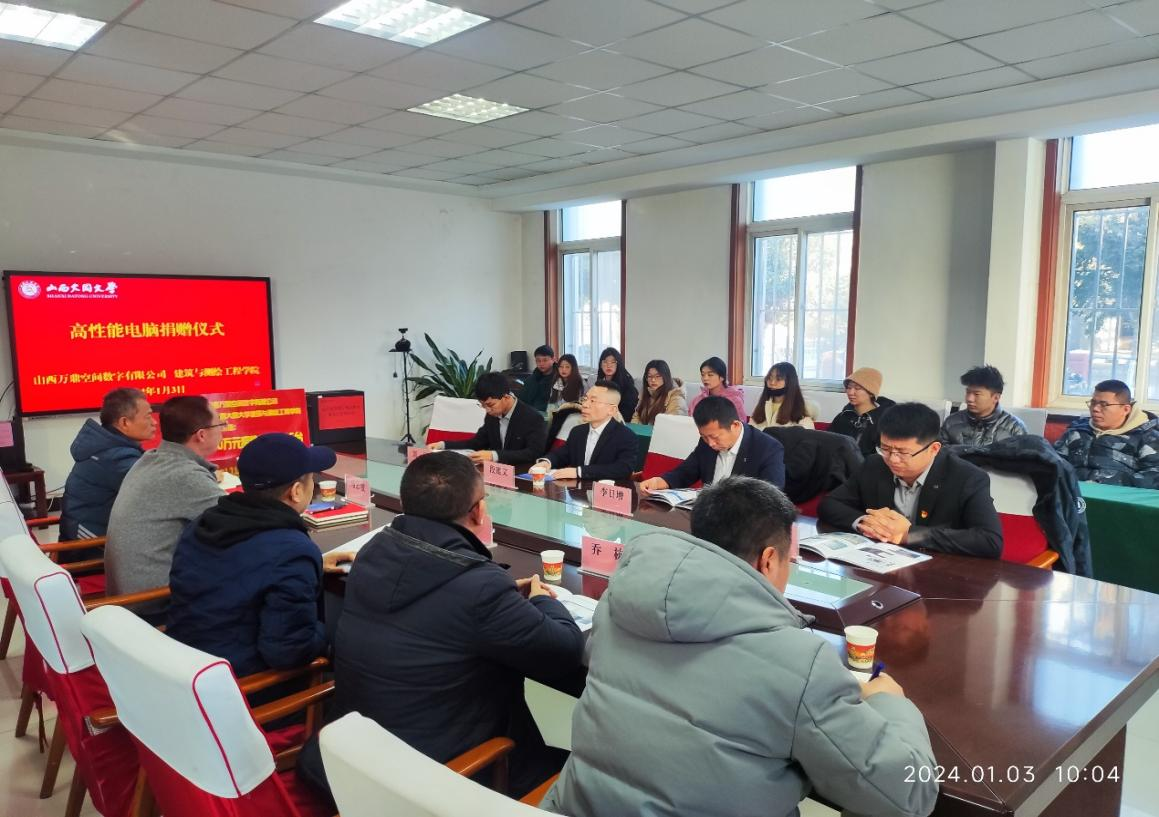 1月3日,山西萬鼎空間數字有限公司向建筑與測繪工程學院捐贈價值30萬元高性能電腦15臺,捐贈儀式在新平旺校區辦公樓一層會議室舉行。學院黨委書記馬云波、黨委副書記姚占魁、副院長徐廣翔、副院長喬棟,山西萬鼎空間數字有限公司董事長段建文、副總經理劉洋、副總經理李日增、董事長助理張義杰等出席本次儀式,建測學院相關專業師生代表參加捐贈儀式。儀式由馬云波主持。