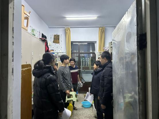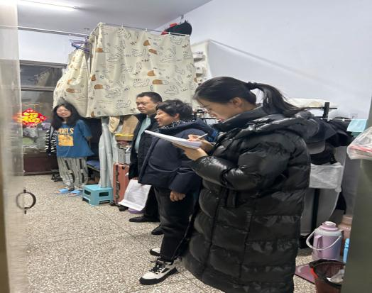 1月21日晚,校學生工作部、后勤管理部聯合學院安全檢查小組對寒假留宿學生宿舍進行安全檢查。中醫藥健康服務學院副院長(行政負責人)白振軍、黨委副書記董文華及實習生班主任杜婧對實習生的日常學習和生活進行了詢問,并希望各位實習生吸取河南南陽學校火災事件的教訓,對宿舍用電安全時刻謹記心上,嚴禁大功率電器,保持通風和干凈整潔的衛生環境。