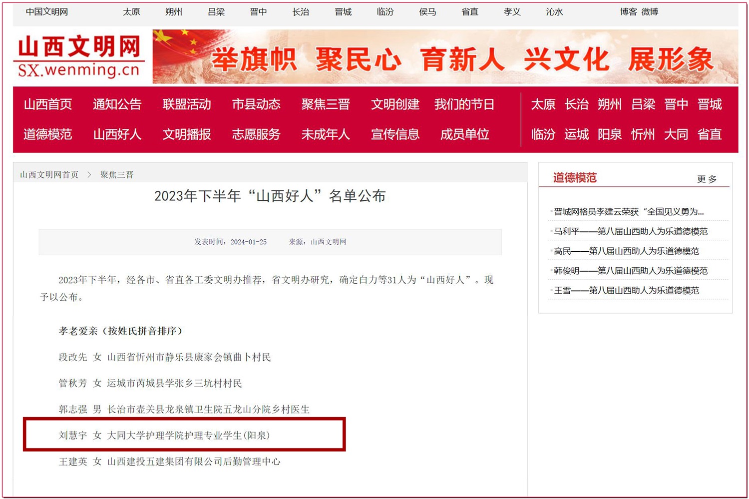 近日,省文明辦公布了2023年下半年“山西好人”名單,我校護(hù)理學(xué)院學(xué)生劉慧宇入選“山西孝老愛(ài)親好人”,同大學(xué)子又添自強(qiáng)不息榜樣典范。