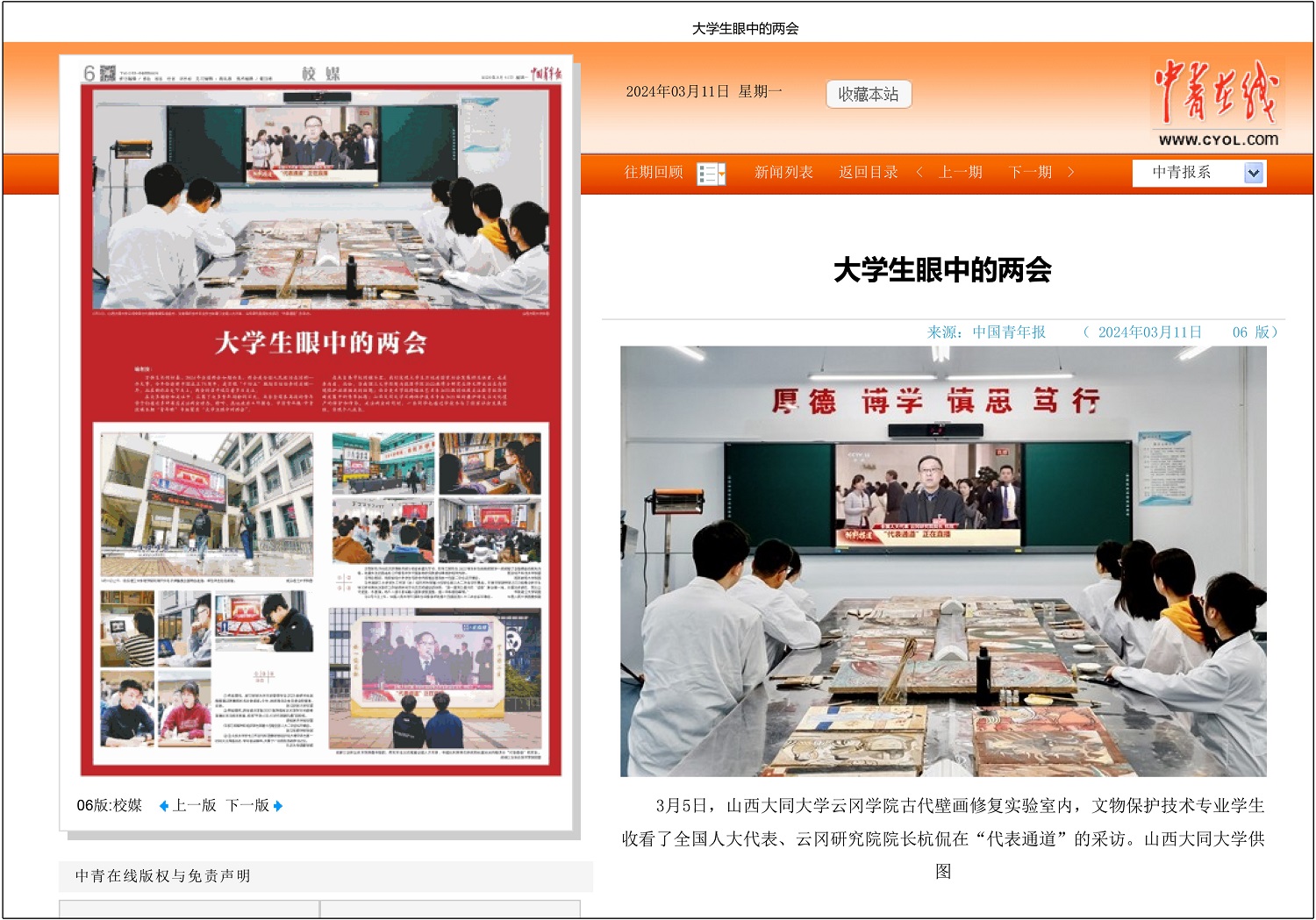3月5日,我校云岡學(xué)學(xué)院文物保護(hù)技術(shù)專業(yè)的學(xué)生在古代壁畫修復(fù)實驗室收看十四屆全國人大二次會議首場“代表通道”上,全國人大代表、云岡研究院院長杭侃接受采訪,積極關(guān)注文化遺產(chǎn)的保護(hù)和傳承。(余致楠)