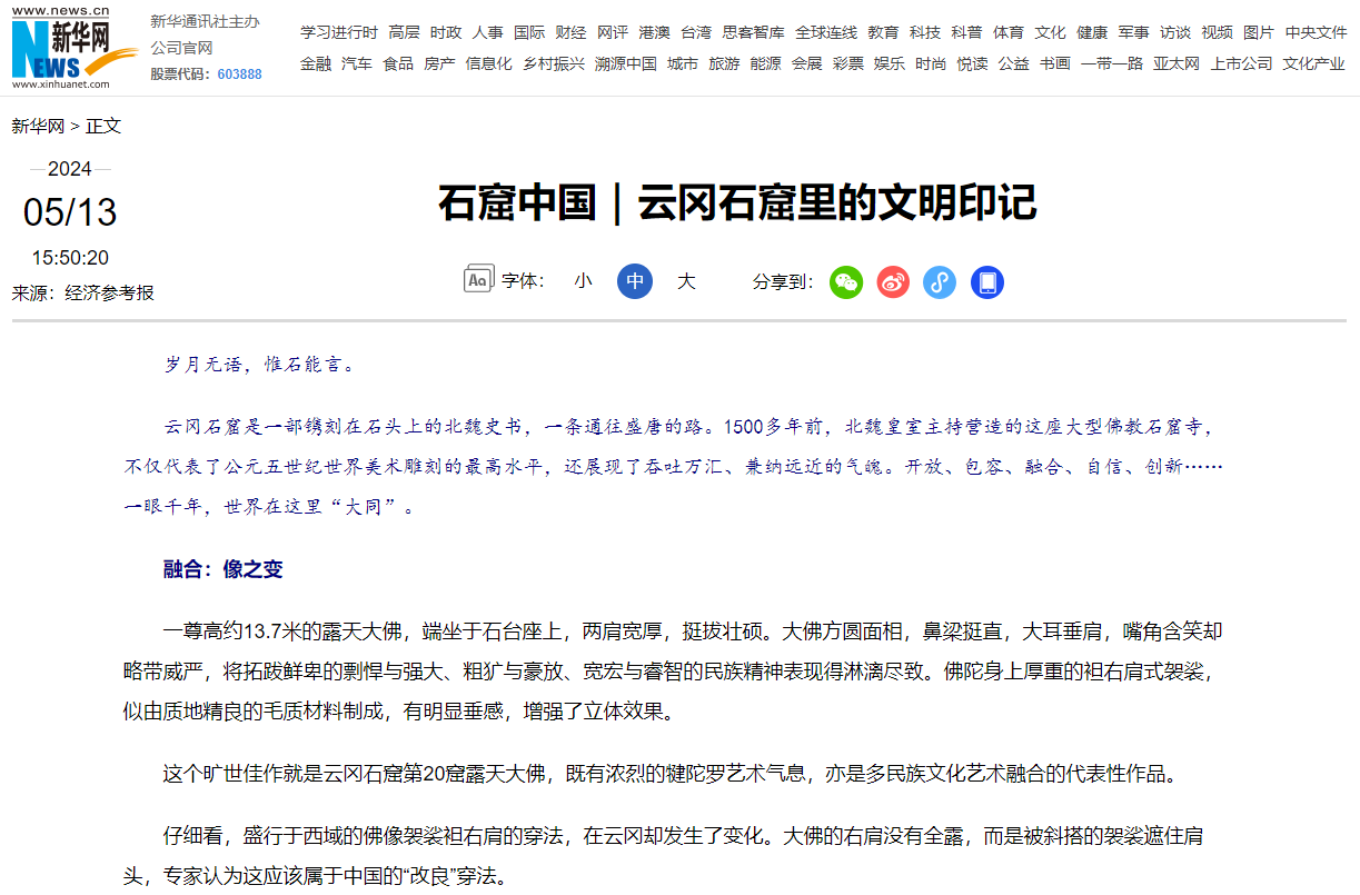 5月13日,新華網推出報道《石窟中國|云岡石窟里的文明印記》,我校音樂學院院長吳巧云接受采訪,她表示,“云岡中期的樂伎雕刻,鮮活地記載了北魏宮廷音樂‘戎華兼采、胡樂鏗鏘’的盛況,以及各民族音樂大融合的景象。”報道中還稱,“云岡束腰鼓舞、云岡力士舞、云岡伎樂天舞……山西大同大學音樂學院舞蹈系主任李莉加大對云岡石窟伎樂天舞蹈形象的研究,編寫了《云岡舞基礎教程》,不斷創作舞蹈作品,帶領學生們將‘云岡舞’搬上舞臺。”(文字:趙鑫 責編:趙鑫)