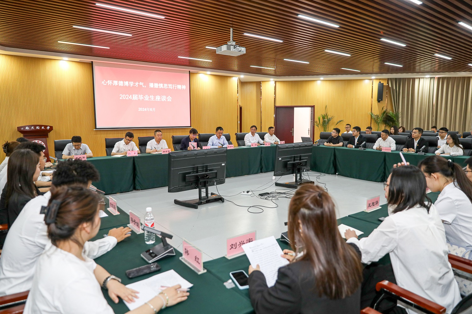 ? 6月15日,山西大同大學“心懷厚德博學才氣,播撒慎思篤行精神”2024屆畢業生座談會在文德樓報告廳召開。與會師生共同重溫學習了習近平總書記五四青年節對全國廣大青年寄語精神、習近平總書記在中共中央政治局第十四次集體學習時的重要講話精神。校黨委書記趙水民出席,與40余名來自各學院各專業的畢業生代表座談交流。校黨委副書記寇福明主持座談會。相關職能部門負責人參加。