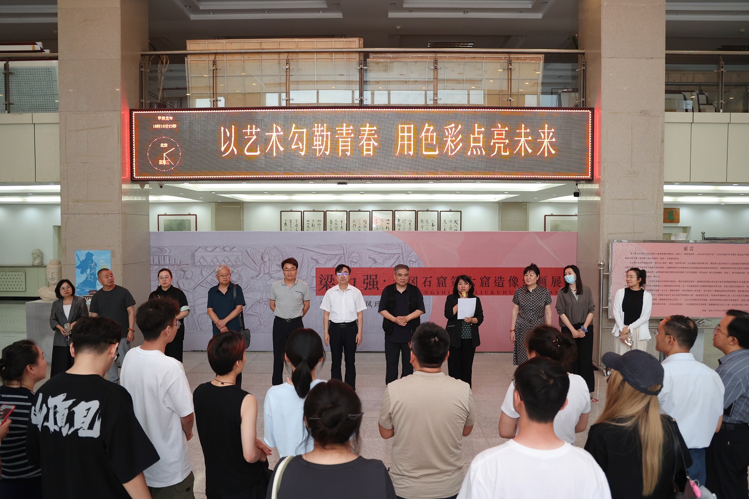 趙水民宣布繪畫展開幕。他對梁力強先生的藝術成就表示高度贊揚,并對其在云岡石窟藝術研究與傳承方面的貢獻表示敬意。他希望,師生要認真學習梁力強先生為藝術堅守的精神,細細品味畫作中展現的各民族交往、交流、交融的歷史內涵,不斷鑄牢中華民族共同體意識。