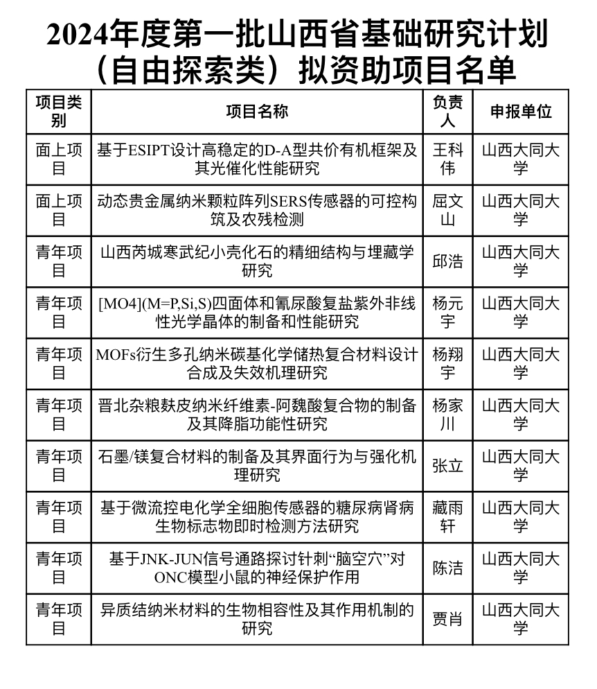 6月21日,山西省科技廳對(duì)2024年度第一批山西省基礎(chǔ)研究計(jì)劃(自由探索類)資助項(xiàng)目予以公示,我校共獲批擬資助項(xiàng)目10項(xiàng)(面上項(xiàng)目2項(xiàng)、青年項(xiàng)目8項(xiàng)),該項(xiàng)目的獲批數(shù)量在省內(nèi)高校中排名第八位。