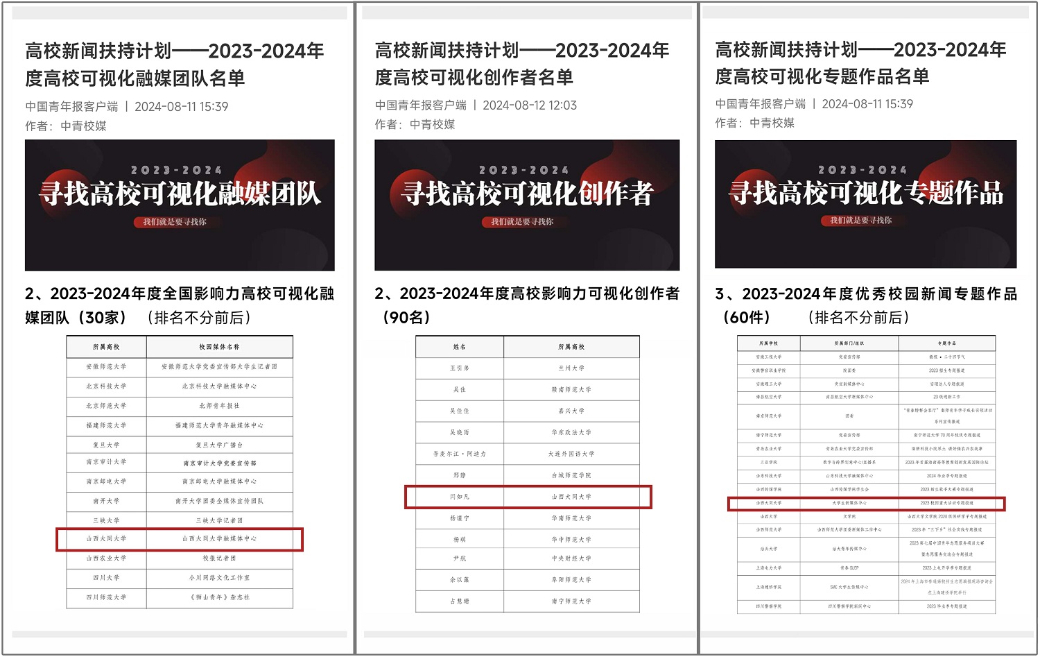 近日,由中國青年報社、中國青少年新媒體協會、中青校媒共同舉辦的“2023-2024高校新聞扶持計劃——尋找高校可視化融媒團隊”“2023-2024高校新聞扶持計劃——尋找高校可視化專題作品”和“2023-2024高校新聞扶持計劃——尋找高校可視化創作者”活動獲獎名單公布,我校在三項評比中均有斬獲。山西大同大學融媒體中心榮獲“2023-2024年度全國影響力高校可視化融媒團隊”稱號,山西大同大學大學生新媒體中心憑借“2023校園重大活動專題報道”榮獲“2023-2024年度優秀校園新聞專題作品”稱號,山西大同大學融媒體中心成員閆如凡同學榮獲“2023-2024年度高校影響力可視化創作者”稱號。