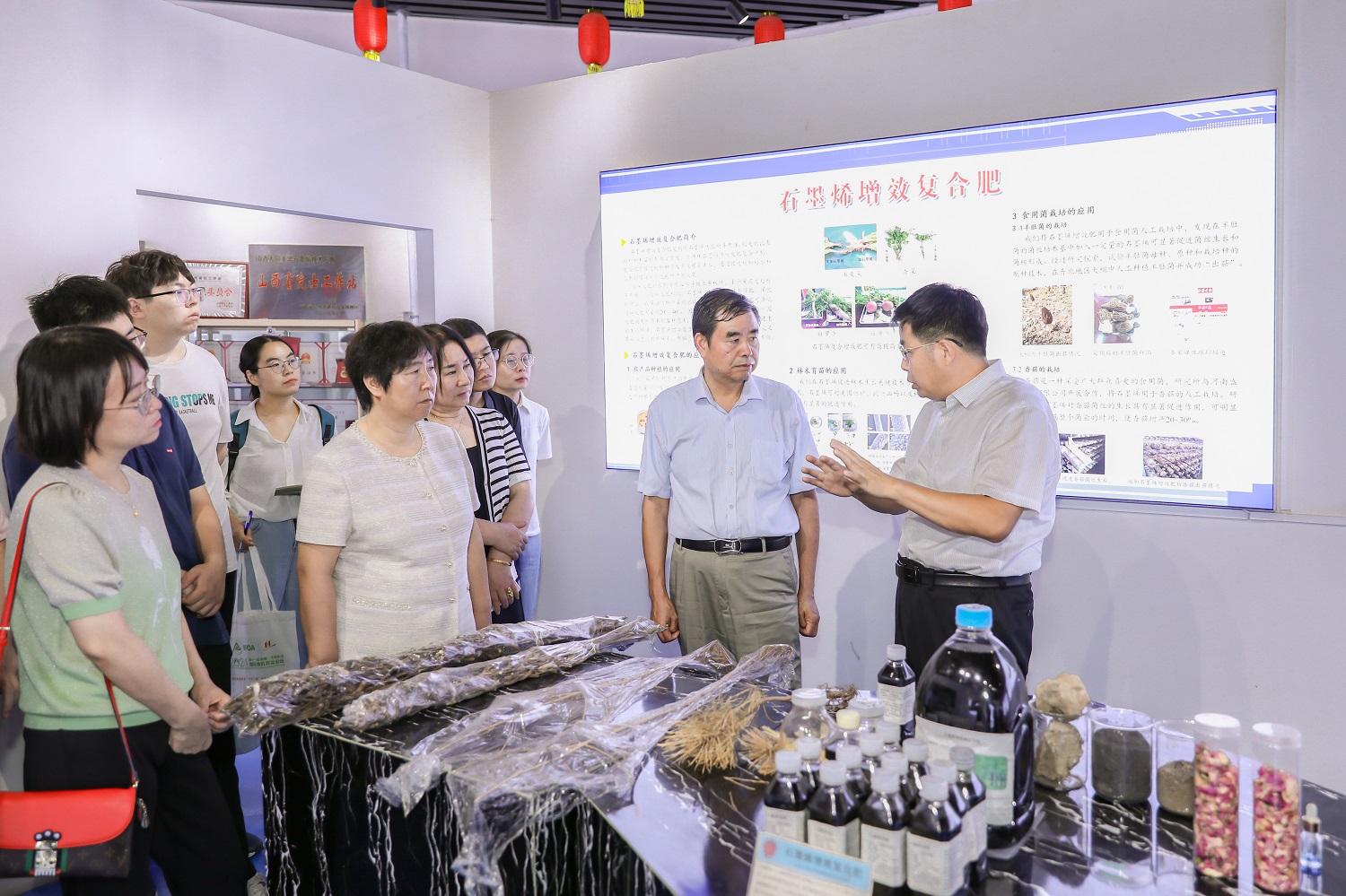 徐明崗一行在姚麗英的陪同下參觀了煤基生態碳匯技術教育部工程研究中心(以下簡稱“工程中心”)。徐明崗認真聽取了工程中心主任趙建國關于石墨烯的應用研究情況介紹,重點了解了石墨烯在農林業生態產業的應用研究,煤基新材料的清潔利用、新產品研發,詳細查看了工程中心實驗室的運行情況,對工程中心在提質增效、改良土壤、環保減碳等方面作出的貢獻表示肯定。