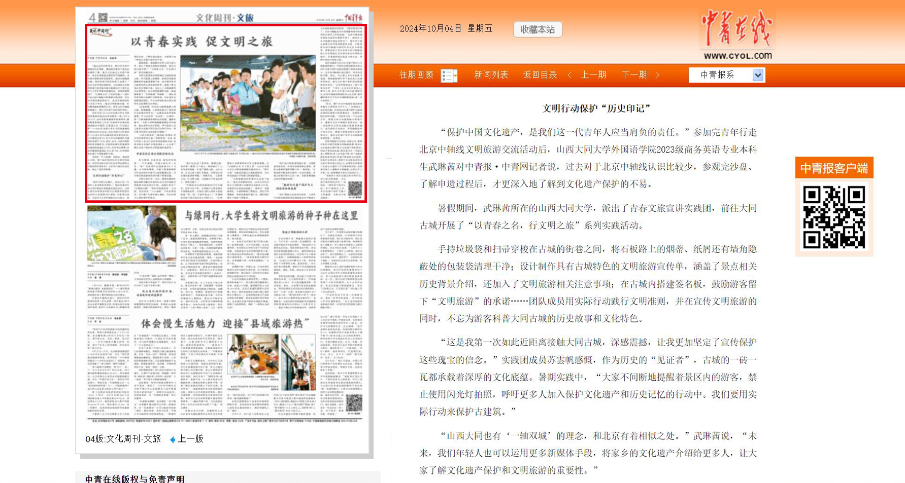“手持垃圾袋和掃帚穿梭在古城的街巷之間,將石板路上的煙蒂、紙屑還有墻角隱蔽處的包裝袋清理干凈;設計制作具有古城特色的文明旅游宣傳單,涵蓋了景點相關歷史背景介紹,還加入了文明旅游相關注意事項;在古城內搭建簽名板,鼓勵游客留下‘文明旅游’的承諾……團隊成員用實際行動踐行文明準則,并在宣傳文明旅游的同時,不忘為游客科普大同古城的歷史故事和文化特色。”中青報·中青網記者描述我校實踐團活動開展情況。