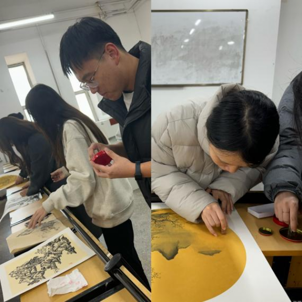 此次活動(dòng)意在加強(qiáng)書法和繪畫專業(yè)學(xué)生之間的交流與合作,促進(jìn)藝術(shù)創(chuàng)作的融合發(fā)展。互贈(zèng)環(huán)節(jié)中,書法專業(yè)同學(xué)為繪畫專業(yè)同學(xué)贈(zèng)送完成篆刻的名章,繪畫專業(yè)同學(xué)現(xiàn)場(chǎng)在繪畫作品上加蓋名章后回贈(zèng)作品。