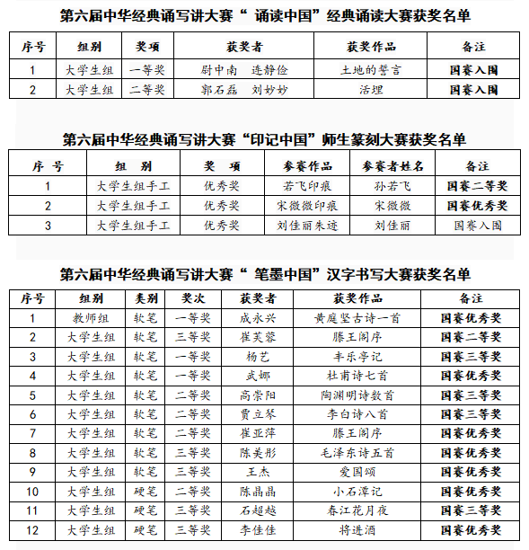 經省教育廳向教育部、國家語委推薦,我校最終斬獲國家級獎項14個。成績的取得,得益于學校良好的育人環境和在語言文化傳承方面深厚的底蘊。學校將以此次獲獎為契機,繼續營造濃厚氛圍,切實落實立德樹人根本任務,將語言文字工作與教育教學、校園文化建設相結合,引導廣大師生進一步提升語言文化素質,傳承弘揚中華優秀傳統文化,增強文化自信自強。(來源:教務部 責編:趙鑫)