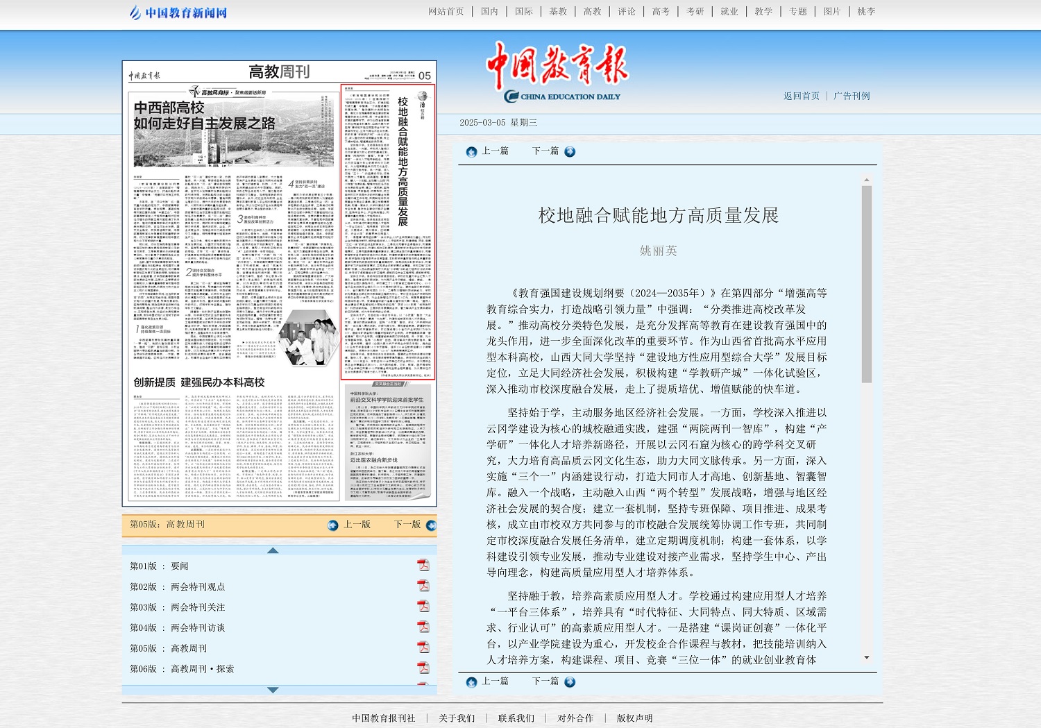 2025年3月5日,《中國教育報》在第5版刊發(fā)了校黨委副書記、校長姚麗英署名文章《校地融合賦能地方高質(zhì)量發(fā)展》,全文如下: