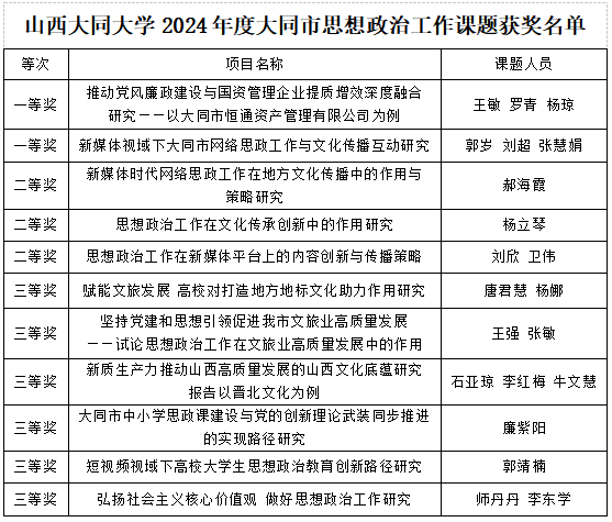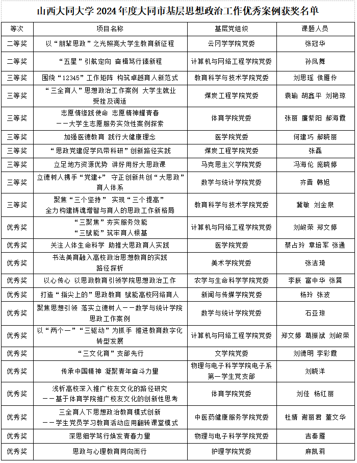 近日,大同市思想政治工作研究會(huì)公布了2024年度思想政治工作獲獎(jiǎng)?wù)n題、2024年度基層思想政治工作優(yōu)秀案例名單。我校共35項(xiàng)成果脫穎而出,其中12項(xiàng)成果榮獲2024年度思想政治工作課題,一等獎(jiǎng)2項(xiàng),二等獎(jiǎng)4項(xiàng),三等獎(jiǎng)6項(xiàng),23項(xiàng)成果榮獲2024年度基層思想政治工作優(yōu)秀案例,二等獎(jiǎng)2項(xiàng),三等獎(jiǎng)8項(xiàng),優(yōu)秀獎(jiǎng)13項(xiàng),獲獎(jiǎng)數(shù)量與質(zhì)量雙創(chuàng)歷年新高。